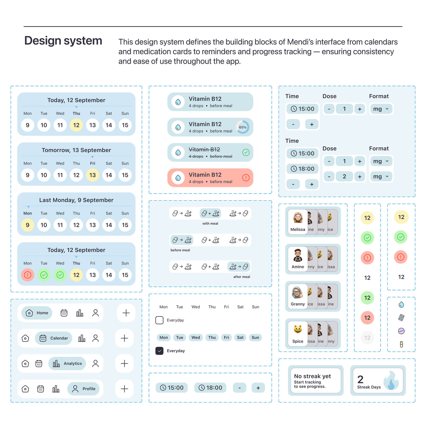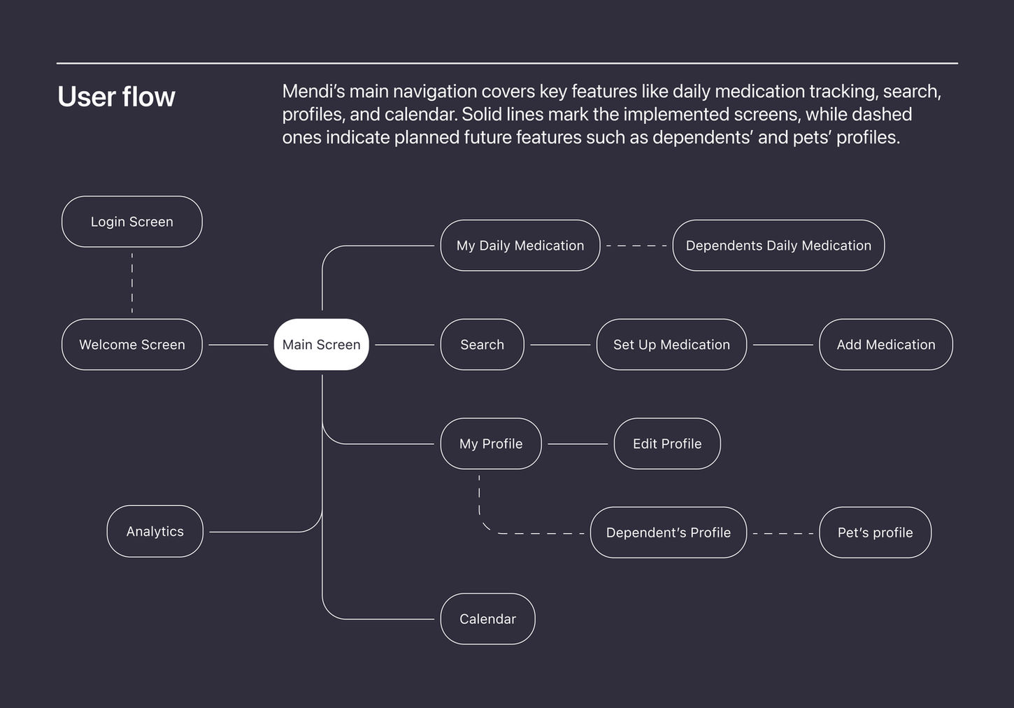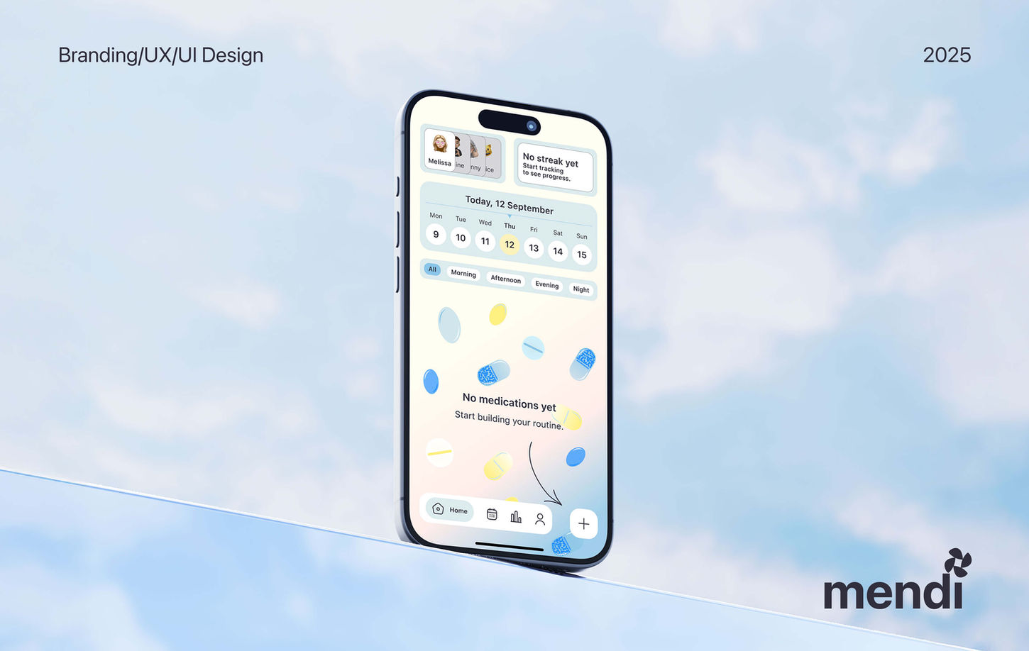 Mendi is a medication management app designed to make daily care simple and supportive. It helps users organize treatments for themselves, family members, and even pets through clear schedules, smart reminders, and easy progress tracking. With multi-profile support, flexible routines, and a calming visual identity, Mendi turns a stressful health task into a smooth, reassuring experience.